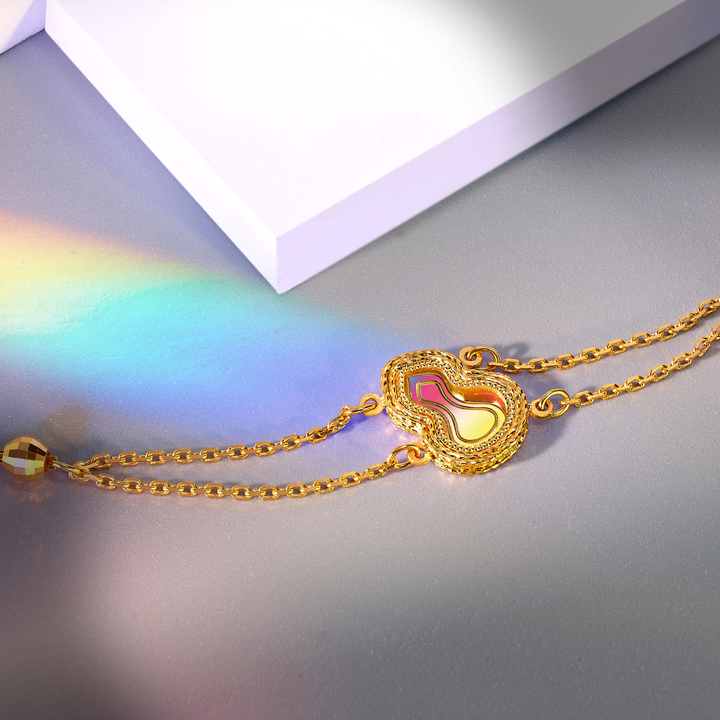将传统的吉祥葫芦元素和现代的设计理念相融合,汲取“福禄”寓意,彰显摩登格调。运用车花工艺层层精饰,以绮丽幻彩衬底,赋予金饰独特的彩虹般的渐变色彩,呈现出光影交错的视觉效果。外圈多层麻花绳纹围边,寄语绳绳相继,祈求子孙平安繁盛。精湛的工艺让金饰充满了艺术气息,每一次摇晃都闪着熠彩光芒。“炫彩葫芦”不仅是一种时尚的选择,更是对美好生活的向往和祝福。