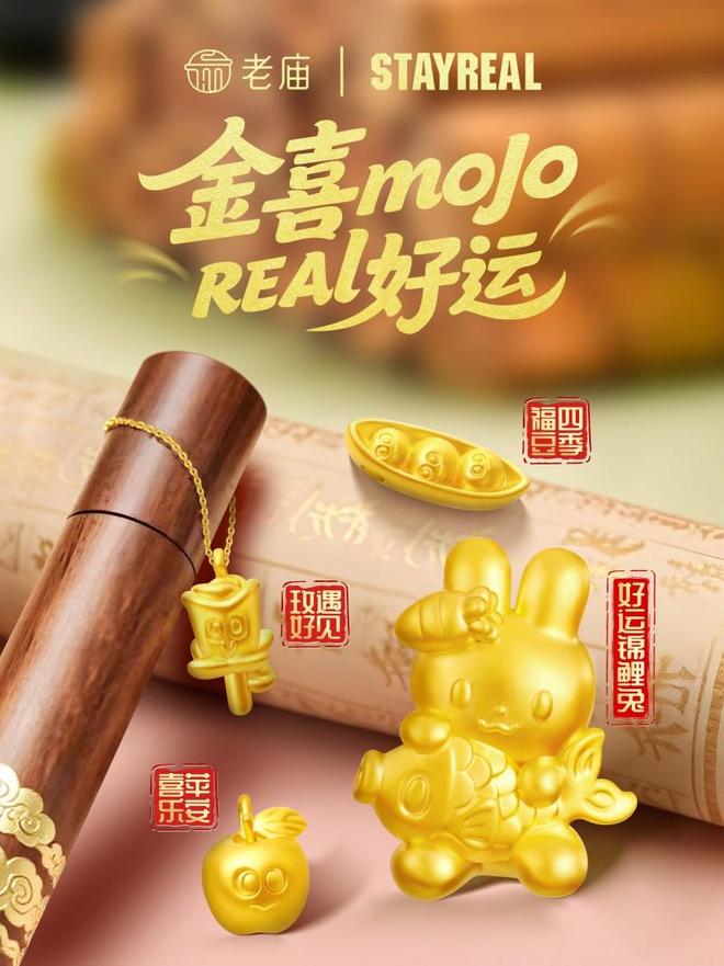 此外,老庙还与创意潮牌STAYREAL合作,将其“MOJO FAMILY”中的三位人气角色融入设计,推出“遇见玫好”、“苹安喜乐”、“四季福豆”等联名黄金产品。借助潮流化设计语言,老庙进一步拓宽年轻消费圈层。