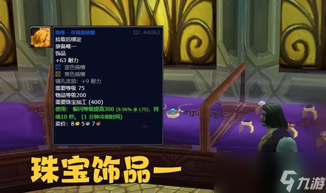 第一款饰品名为“帝黄晶螃蟹”,常驻属性为63点耐力,使用特效为300点闪避值,持续10秒,CD1分钟游艇会。看似这款饰品的耐力加成只有63点,但是这款饰品却附带2个宝石孔,而这两个宝石孔带来的收益是极高的。