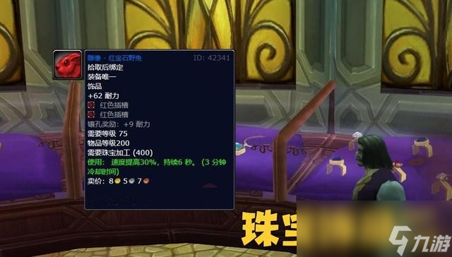 第二件饰品名为“红宝石野兔”,常驻属性为62点耐力,主动特效为30%移动速度,持续6秒,CD3分钟。由于WLK珠宝专属宝石只能同时使用3颗,所以在使用螃蟹饰品的情况下,野兔饰品就只能使用1颗专属宝石了。